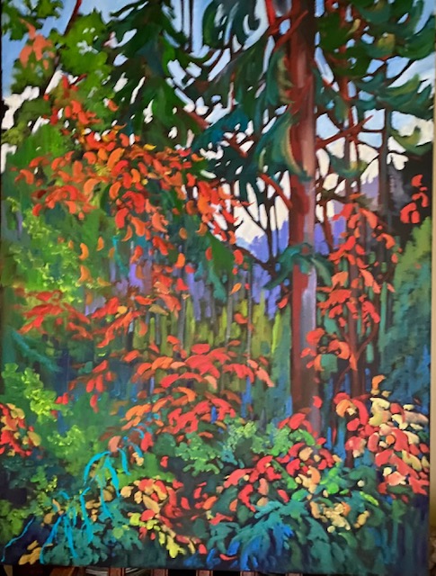 Beginning with a black canvas, then defining structures with cadmium orange, her finished landscapes exudes depth, bold strokes, luscious application of colour and hints of warm reds peeking through. Clients are drawn to the loose, impressionistic interpretation of the "all to familiar" and loved vistas of our North.